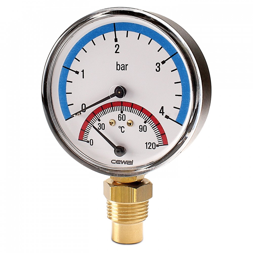 The thermo-pressure gauge combines in one instrument the functionality of a Bourdon spring pressure gauge and a bimetallic thermometer.