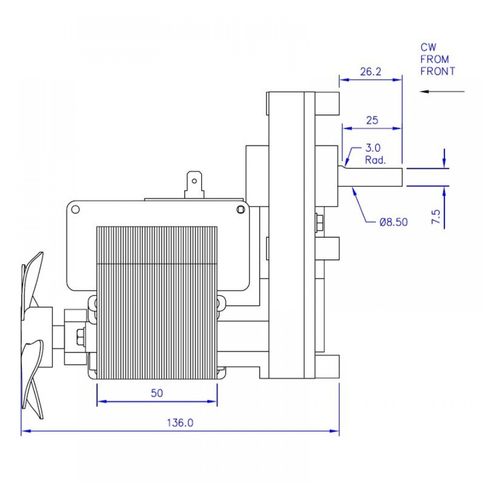T3 sorozat, 20 Nm kimeneti nyomaték, 52 Watt fogyasztás, 8 ford./perc fordulatszám, óramutató járásával megegyező forgás, 8.5mm tengelyátmérő, 50mm mágneses mag, 220 V AC 50/60 Hz táp.