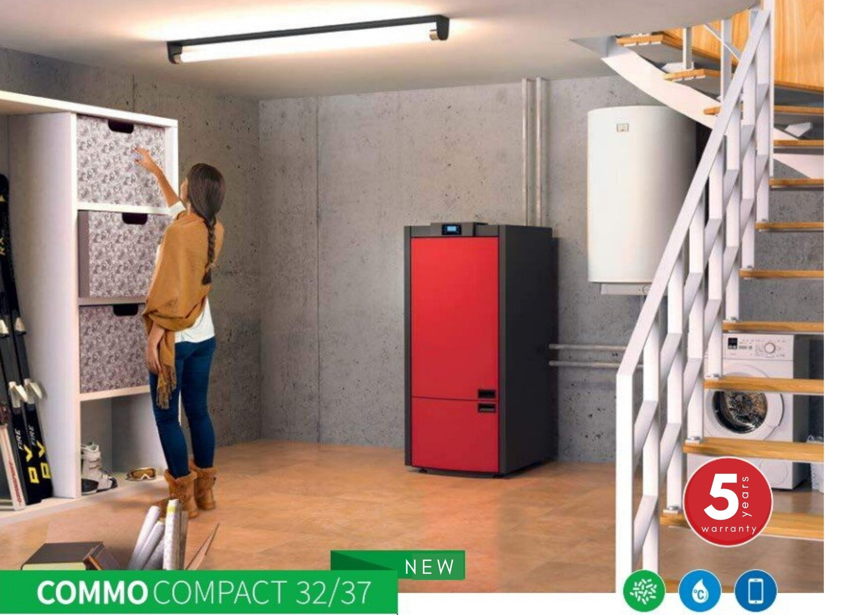 Alfa Plam Commo Compact pellet kazán, amely elegáns kialakításának köszönhetően minden környezetbe illeszkedik. 37 kW teljesítményével tökéletesen alkalmas akár 370 m 2 -es (körülbelül) helyiségek fűtésére.
