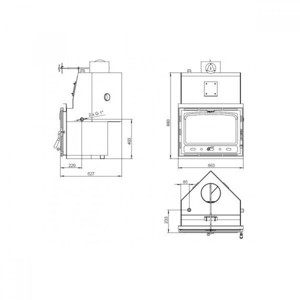 Fa tüzelésű kandalló vízköpennyel és egyszerű kivitelben. Öntöttvas ajtó és belső hamutartó. Sarokba helyezhető és biztonságos fogást biztosító fa fogantyúkkal felszerelt.