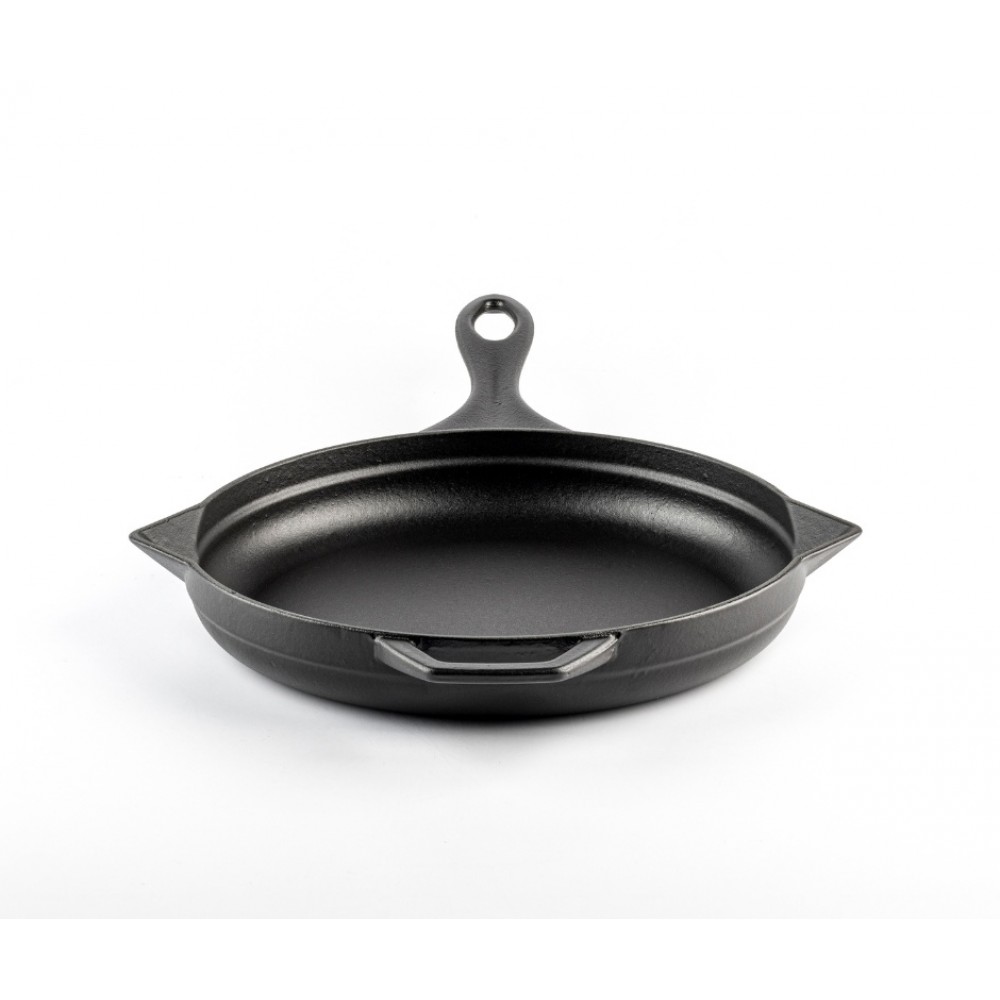 Mindegyik serpenyőben egy rövid fogantyú található, így könnyen szállítható az asztalhoz és onnan. A hosszú fogantyú akasztónyílással rendelkezik a könnyű tárolás érdekében, a két beépített kifolyó pedig megkönnyíti a folyadékok öntését.